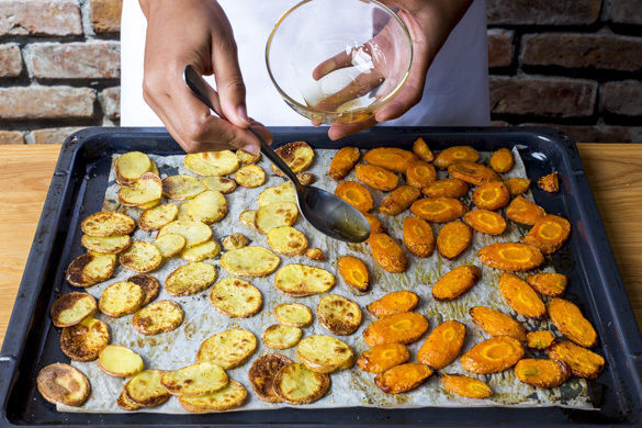 Den Backofen auf 200°C (180°C Umluft) vorheizen. 750g Kartoffeln samt Schale in ca. 0,5cm dünne Scheiben schneiden. Die Karotten ggf. schälen und schräg in ca. 1cm dicke Scheiben schneiden. Das Gemüse auf ein mit Backpapier ausgelegtes Backblech geben, mit 1½EL Pflanzenöl und je 1 kräftige Prise Salz und Pfeffer vermengen und 25–30Min. im Ofen rösten. Nach der Hälfte der Zeit wenden.