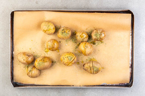 Den Backofen auf 220°C (200°C Umluft) vorheizen. Die Kartoffeln mit einem scharfen Messer im Abstand von ca. 0,5cm einschneiden, aber nicht ganz durchschneiden.