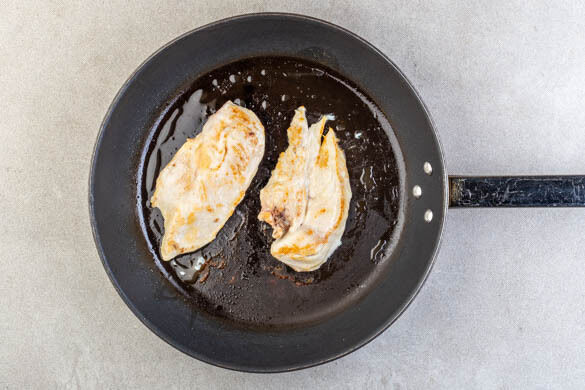 In der Zwischenzeit das Fleisch trocken tupfen und horizontal in je zwei gleich große Stücke schneiden. Beide Seiten mit je 1 Prise Salz würzen. 1EL Olivenöl in einer großen Pfanne bei mittlerer bis starker Hitze erwärmen, dann das Fleisch auf jeder Seite 2–3Min. anbraten, bis es von außen appetitlich gebräunt ist. Es soll noch nicht durchgaren.