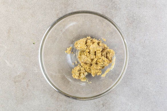 In einer Schüssel 3EL Mayonnaise mit 2EL Olivenöl, ½TL Senf, den Semmelbröseln und der restlichen Gewürzmischung zu einer dicken, streichfähigen Paste verrühren.