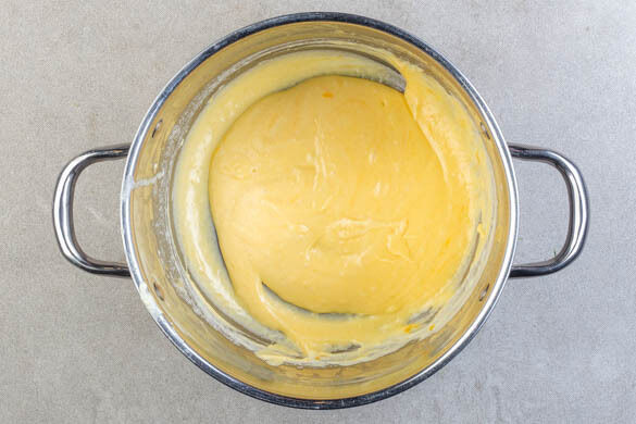 In dem aufbewahrten Topf 1½EL Butter bei mittlerer Hitze schmelzen. Mit einem Schneebesen 1EL Mehl einrühren und ca. 20Sek. anschwitzen. Dann langsam ca. 2EL Mozzarella-Flüssigkeit und die restliche Kochsahne unter ständigem Rühren hinzugeben, bis eine dickflüssige Sauce entsteht. Vom Herd nehmen und den Käse unterrühren, bis er geschmolzen ist. Mit 1 Prise Salz würzen.