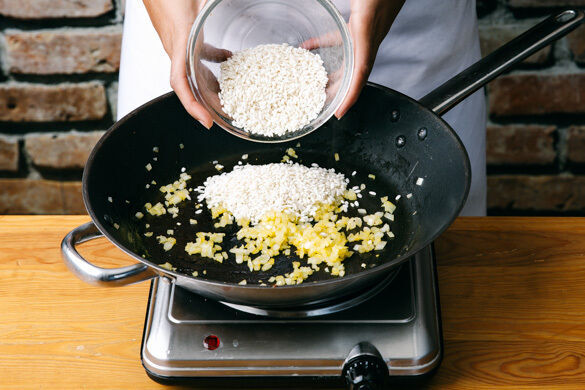 Die Zwiebel schälen, halbieren und fein würfeln. Den Knoblauch ebenfalls schälen und fein würfeln. Die Zwiebeln in einer großen Pfanne mit 1EL Olivenöl bei mittlerer Hitze 2–3Min. farblos anschwitzen. Den Reis dazugeben und 1–2Min. anrösten.