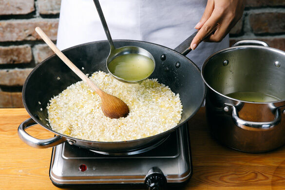 Die Zucchini mit der restlichen Brühe zusammen in die Pfanne geben und stetig rühren, bis der Reis die Brühe aufgesaugt hat und bissfest ist. Evtl. etwas mehr Wasser zugeben. Die gesamte Garzeit des Risottos beträgt 18–20Min. Den Käse einrühren, dann das Risotto mit Salz und Pfeffer abschmecken.
