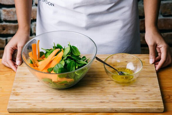 Die Karotte ggf. schälen, dann mit einem Sparschäler in feine Streifen schneiden und unter den Spinat heben. Die Zitronenschale abreiben, dann die Zitrone halbieren und auspressen. 1TL Zitronenschale, 1EL Zitronensaft, 1EL Olivenöl sowie je 1 Prise Salz und Pfeffer zu einem Dressing verrühren und mit dem Salat vermengen.