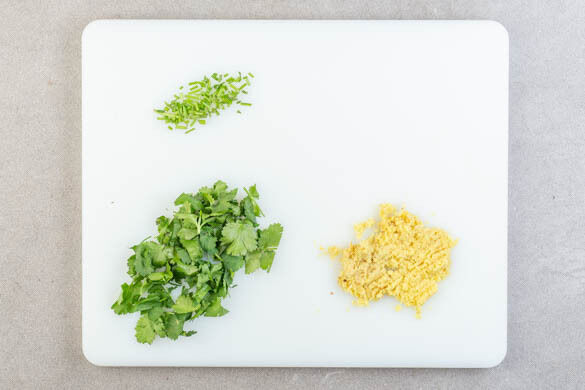 Den Ingwer schälen und fein reiben. Die Korianderblätter von den Stängeln zupfen und die Korianderblätter und -stängel separat grob schneiden.