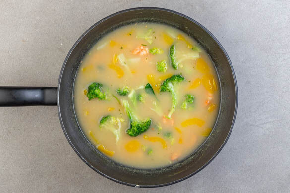 Das Brühgewürz in 1,5L heißem Wasser auflösen. Den Ingwer und die Korianderstängel in einem Wok oder einer großen Pfanne mit 1EL Pflanzenöl bei starker Hitze ca. 30Sek. anbraten. Mit der Brühe ablöschen. Den Brokkoli und die Paprika in die Brühe geben und in 4–5Min. gar kochen.