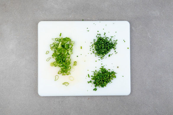 Zwischendurch den grünen Teil der Lauchzwiebel ebenfalls in sehr feine Ringe schneiden. Die Petersilie samt Stängeln fein hacken. Den Schnittlauch in feine Röllchen schneiden.