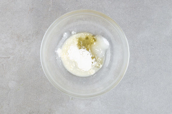 Die Zitrone halbieren und auspressen. Die ½ des Zitronensafts in einer großen Schüssel mit 2EL Honig, 2EL Zucker und 2EL Mehl verrühren.