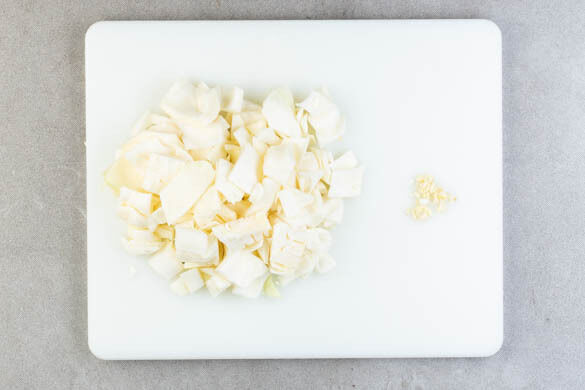 Den Weißkohl halbieren und in mundgerechte Stücke schneiden, dabei den Strunk entfernen. Den Knoblauch schälen und fein würfeln.