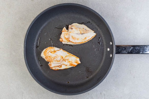 Das Fleisch trocken tupfen und jeweils horizontal in 2 gleichmäßige Filets schneiden. Von beiden Seiten mit je 1 Prise Salz und Pfeffer würzen, dann das Fleisch in der Pfanne mit 1EL Olivenöl bei mittlerer bis starker Hitze auf jeder Seite ca. 2Min. anbraten, bis es gebräunt, aber noch nicht ganz gar ist.
