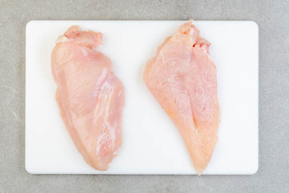 Das Fleisch trocken tupfen, dann horizontal halbieren und mit der Messerspitze mehrmals einstechen.