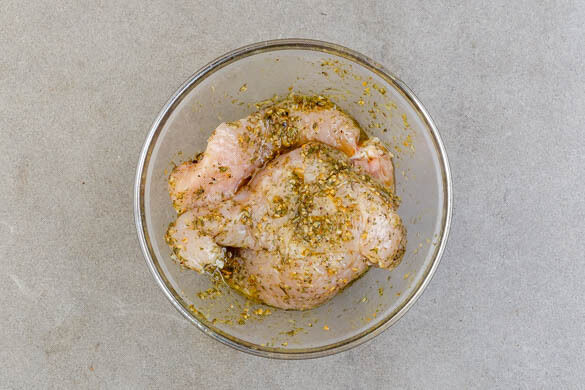 Die ½ der Zitronenschale abreiben, dann die Zitrone halbieren und eine Hälfte auspressen. Die übrige Hälfte für ein anderes Rezept aufbewahren. In einer Schüssel die ½ des Zitronensafts mit ½EL Olivenöl, der ½ der Gewürzmischung, ½TL Salz und 1 Prise Pfeffer zu einer Marinade verrühren. Dann das Fleisch untermengen und beiseitestellen.