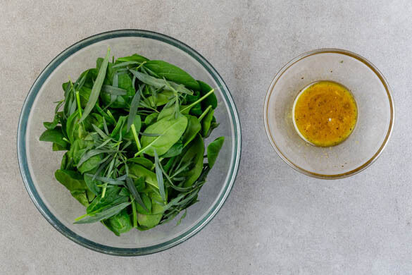 Für das Dressing den restlichen Zitronensaft mit 1EL Olivenöl, 1TL Honig, ½TL Senf und je 1 Prise Salz und Pfeffer verrühren. Den Spinat und den übrigen Estragon mit dem Dressing vermengen. Eine Grillpfanne oder normale Pfanne ohne Zugabe von Fett bei mittlerer bis starker Hitze erwärmen.