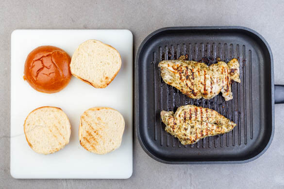 Aufgepasst, es gibt einen supersaftigen Burger! Belegt mit zartem Bio-Hähnchenfilet, das erst mit Zitronensaft und einer Knoblauch-Kräuter-Gewürzmischung mariniert und dann lecker in der Pfanne gegrillt wird. Dazu gibt es gebackene Süßkartoffelspalten mit einer raffinierten Estragon-Mayo mit Zitronenschale. Ein würziger Spinatsalat komplettiert das feine Mahl. Guten Appetit!