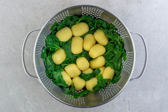 Während der letzten ca. 30Sek. den Spinat in den Topf geben und mitkochen. Die Gnocchi und den Spinat in ein Sieb abgießen und abtropfen lassen.