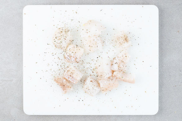 Den Fisch mit kaltem Wasser abspülen, trocken tupfen und evtl. vorhandene Gräten mit einer Pinzette entfernen. Die Fischstücke mit 2–3 Prisen Gewürzmischung sowie Salz und Pfeffer würzen.