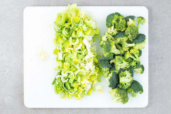 Den Lauch längs halbieren und in ca. 0,5cm dünne Streifen schneiden. Den Brokkoli in ca. 2cm kleine Röschen schneiden, den Strunk grob würfeln. Den Knoblauch schälen und fein würfeln.