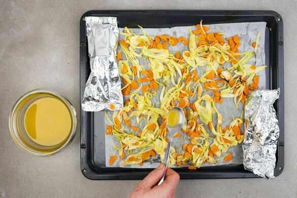 Den Fenchel der Länge nach vierteln, dann in dünne Streifen schneiden, dabei den harten Strunk entfernen. Die Karotten ggf. schälen, längs halbieren und schräg in dünne Scheiben schneiden. Das Gemüse mit 3EL Olivenöl, ½TL Salz und 1 kräftigen Prise Pfeffer auf einem zweiten mit Backpapier ausgelegten Backblech vermengen und in 15–20Min. im Ofen goldbraun backen.