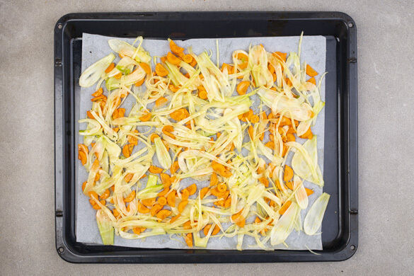 Den Fenchel der Länge nach vierteln, dann in dünne Streifen schneiden, dabei den harten Strunk entfernen. Die Karotten ggf. schälen, längs halbieren und schräg in dünne Scheiben schneiden. Das Gemüse mit 1EL Olivenöl und je 1 kräftigen Prise Salz und Pfeffer auf einem zweiten mit Backpapier ausgelegten Backblech vermengen und in 15–20Min. im Ofen goldbraun backen.