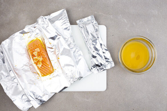 Die Orangenschale abreiben, dann die Orange halbieren und auspressen. Den Knoblauch schälen und in feine Scheibchen schneiden. Den Fisch jeweils auf ein Stück Alufolie legen. Mit insgesamt 1TL Olivenöl beträufeln und mit je 1 Prise Salz und Pfeffer würzen. Die Orangenschale und den Knoblauch über den Fisch streuen und die Alufolie zu luftdichten Paketen falten.