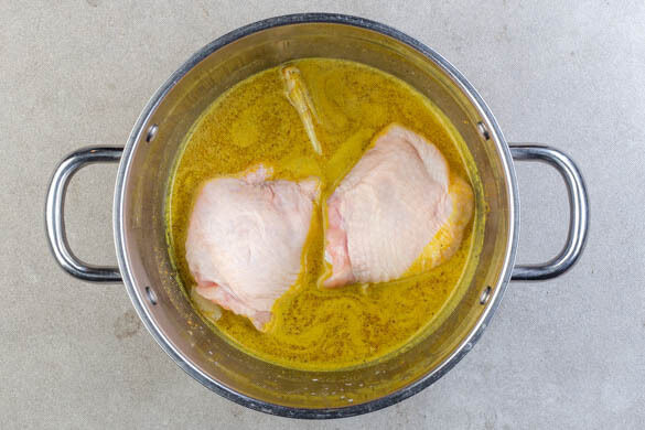 Das Fleisch trocken tupfen. Die Kokosmilch, das Currypulver, die Basilikumstängel und 1TL Salz in den Topf geben und verrühren. Das Fleisch zugeben und abgedeckt aufkochen lassen, dann ca. 15Min. sanft köcheln lassen. Anschließend den Knoblauch, das Zitronengras und die Basilikumstängel entfernen.