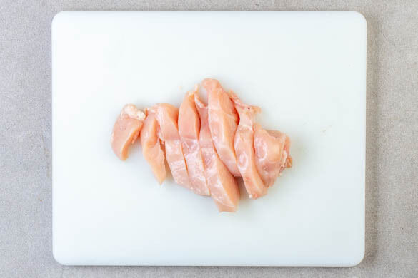 In einem großen Topf ausreichend gesalzenes Wasser für die Pasta zum Kochen bringen. Das Fleisch trocken tupfen und in ca. 1cm breite Streifen schneiden.