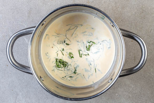 In einem kleinen Topf die Kochsahne, die Sojasauce und 1EL hellen Essig bei mittlerer Hitze erwärmen. Die Salbeiblätter von den Stängeln zupfen, davon ca. ⅔ der Blätter fein schneiden und in die Sauce geben. Alles einmal aufkochen lassen und dann bei niedriger Hitze 10–12Min. sanft köcheln.