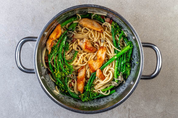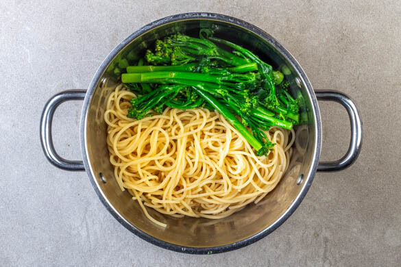 Die Pasta in das kochende Wasser geben und 5–6Min. kochen lassen. Dann die Brokkolini dazugeben und weitere 2–3Min. mitkochen, bis die Pasta und die Brokkolini gar sind. In ein Sieb abgießen, dann zurück in den Topf geben und abgedeckt warm halten.