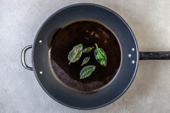 Die restlichen abgezupften Salbeiblätter in einer großen Pfanne mit 1EL Olivenöl bei mittlerer Hitze ca. 1Min. knusprig anbraten, dann auf Küchenkrepp abtropfen lassen. Die Pfanne auf dem Herd lassen.