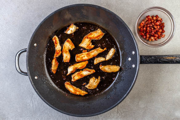 Den Speck in derselben Pfanne bei mittlerer Hitze in 2–3Min. rundum knusprig braten und ebenfalls aus der Pfanne nehmen. Das Fleisch in der Pfanne bei mittlerer bis starker Hitze ca. 5Min. braten, bis es goldbraun und gar ist.