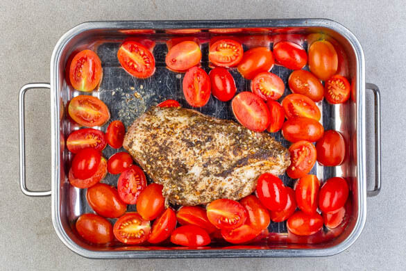 Das Fleisch in einer großen Pfanne mit 1EL Olivenöl bei mittlerer Hitze auf jeder Seite 2–3Min. goldbraun anbraten. In eine Auflaufform geben, die Kirschtomaten um das Fleisch verteilen und alles ca. 10Min. im Ofen backen, bis das Fleisch gar ist.