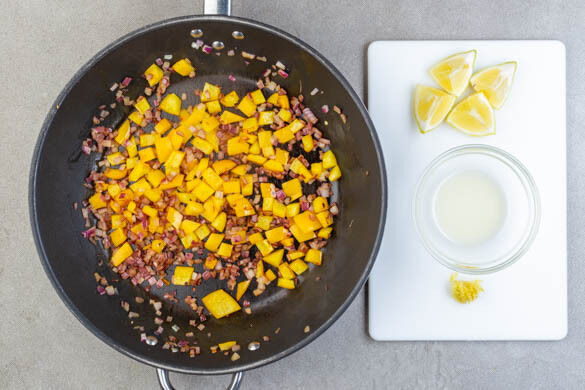Die Paprika und die Zwiebeln in derselben Pfanne mit 1EL Olivenöl bei mittlerer Hitze 3–5Min. anbraten, mit Salz und Pfeffer abschmecken. Währenddessen die Zitronenschale abreiben und die Zitrone halbieren, eine Hälfte auspressen, die andere Hälfte in Spalten schneiden.