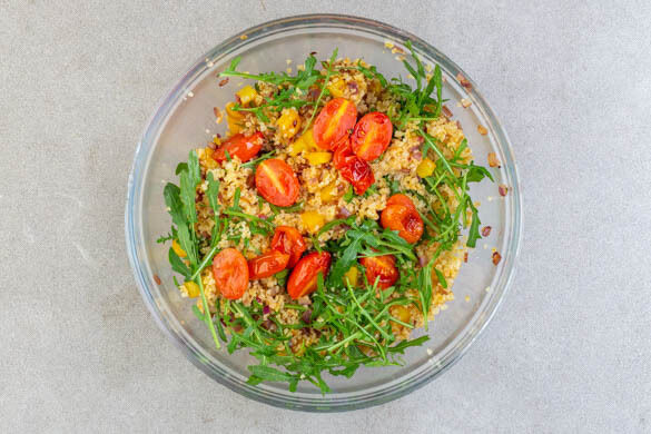 Den Bulgur mit den Kirschtomaten, dem Paprika-Zwiebel-Gemüse und dem Rucola vermengen und den Salat mit 1–2TL Zitronenschale, 1–2EL Zitronensaft, 2EL Olivenöl sowie Salz und Pfeffer abschmecken. Das Fleisch in Tranchen schneiden, auf dem Bulgursalat anrichten und mit den Zitronenspalten servieren.