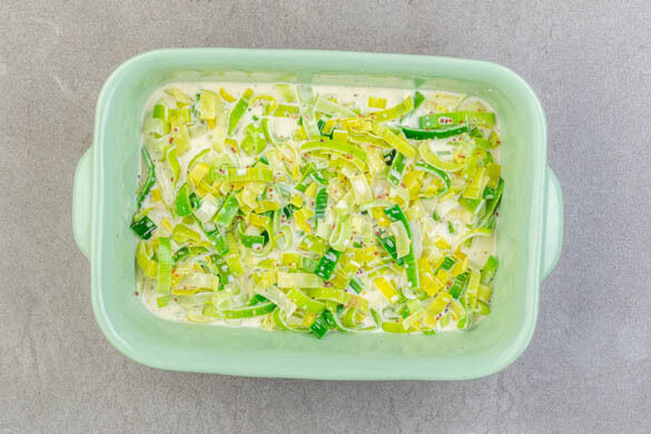 Die Kochsahne, 1½EL körnigen Senf und 1 Prise Salz unter den Lauch rühren. Ca. ¾ der Lauchcreme gleichmäßig in einer mittelgroßen Auflaufform verteilen, die übrige Lauchcreme für die Cannelloni aufbewahren.