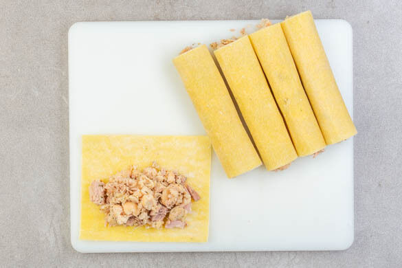Die ½ der Lasagneblätter jeweils entlang einer der Längsseiten mit 3–4EL Thunfisch-Bohnen-Füllung belegen und die Füllung verstreichen, sodass sie etwa ¾ des Lasagneblatts bedeckt. Die Lasagneblätter ausgehend von der Längsseite mit Füllung Richtung Längsseite ohne Füllung zu Cannelloni aufrollen und in die Auflaufform legen.