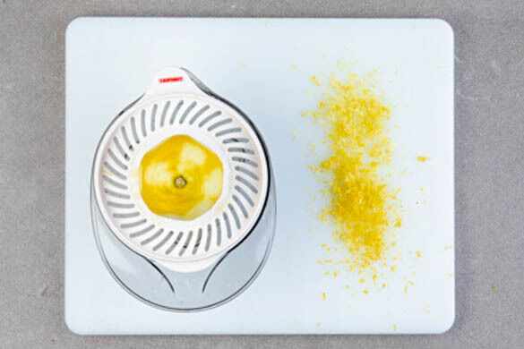 In einem kleinen Topf 300ml leicht gesalzenes Wasser für den Bulgur zum Kochen bringen. Die Zitronenschale abreiben, dann die Zitrone halbieren und auspressen.