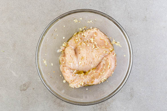 Den Knoblauch schälen, sehr fein würfeln und mit 1EL Olivenöl, 1TL Zitronensaft, ¼ der Gewürzmischung und 1 kräftigen Prise Salz zu einer Sauce verrühren. Das Fleisch mit etwas Küchenkrepp trocken tupfen, horizontal in 2 gleich große Stücke schneiden und mit der Würzsauce einreiben.