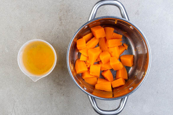 Die Süßkartoffeln in das kochende Wasser geben und abgedeckt in ca. 10Min. weich kochen. 1 Tasse Kochwasser abschöpfen, dann die Süßkartoffeln in ein Sieb abgießen, zurück in den Topf geben und abgedeckt warm halten.