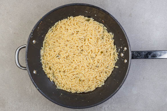 mit karamellisierten Zwiebeln auf Käse-Risoni