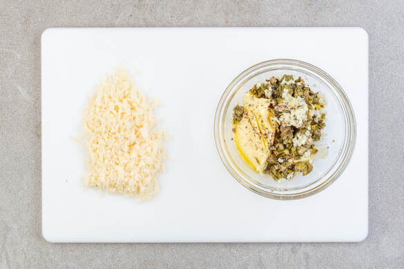 In einem großen Topf 2L gesalzenes Wasser für die Pasta zum Kochen bringen. 5EL Butter in der Mikrowelle erwärmen, bis sie weich ist. Die Kapern grob hacken. Den Knoblauch schälen und fein würfeln. Die Kapern, den Knoblauch und 1 Prise Pfeffer unter die Butter mischen. Den Käse fein hacken.