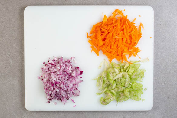 In einem mittelgroßen Topf ausreichend gesalzenes Wasser für die Nudeln zum Kochen bringen. Den Stangensellerie in möglichst dünne Scheiben schneiden. Die Karotten ggf. schälen und grob raspeln. Die Zwiebel schälen, halbieren und fein würfeln.