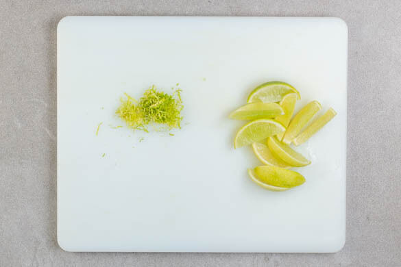 Die Limettenschale fein abreiben, dann die Limette halbieren und in Spalten schneiden.