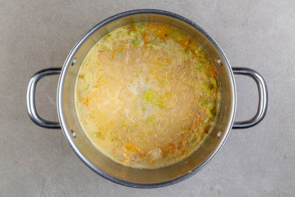 Mit dieser leckeren Suppe verlässt keiner hungrig den Tisch. Das zarte Hähnchenfleisch wird mit Karotte, Zwiebel und aromatischer Knoblauch-Ingwer-Paste in Brühe gegart. Kokosmilch sorgt für das cremige Finish, knackiger Sellerie und Glasnudeln für noch mehr Substanz. Guten Appetit!
