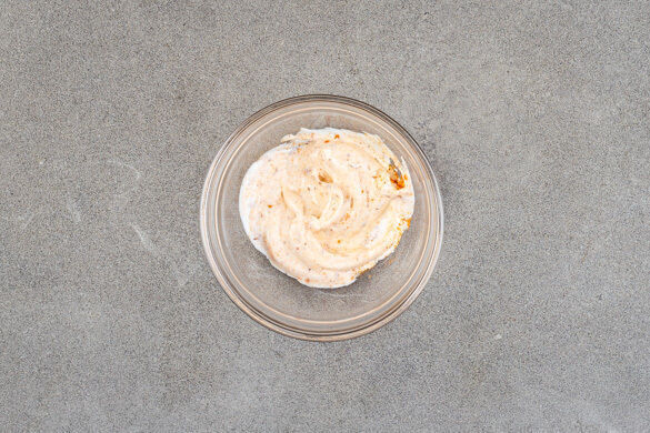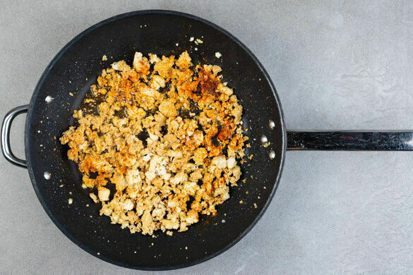 300g Tofu trocken tupfen, dabei möglichst viel Flüssigkeit auspressen, dann grob zerkrümeln und in einer großen Pfanne mit 2EL Pflanzenöl, 1TL Salz und 1 Prise Pfeffer bei starker Hitze ca. 5Min. goldbraun braten. Die ½ der Gewürzmischung und den restlichen Knoblauch untermengen und ca. 1Min. weiterbraten, bis der Tofu leicht knusprig ist.