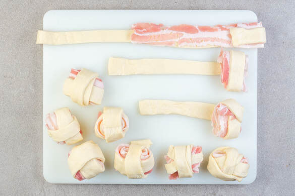 Jeweils eine Baconscheibe auf einen Teigstreifen geben und bis zum Bacon bündig aufrollen. Dann das restliche Stück der Teigstreifen um die Rollen zu Knoten wickeln.