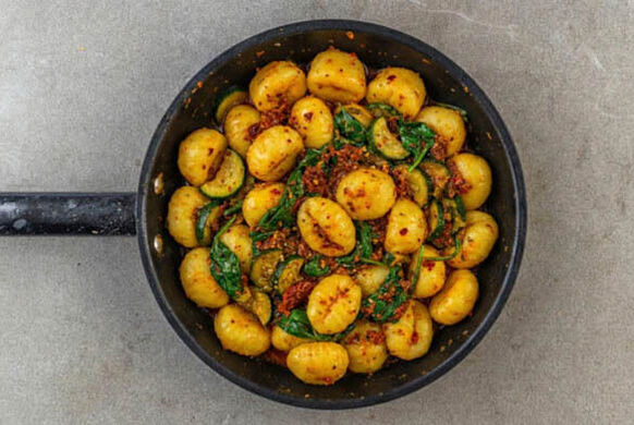 Dieses Gericht ist perfekt für jene anstrengenden Tage, an denen abends eigentlich nur wenig Zeit und Lust zum Kochen bleibt. Wir behaupten: Es steht flotter auf dem Tisch als der Lieferdienst vor der Tür. Schnell die Zucchini goldbraun anbraten, die Käse-Gnocchi kochen und den Spinat garen – und schon kommt ein lecker-würziges Tomaten-Oliven-Pesto dazu. Serviert wird mit gehobeltem Hartkäse. Schnell und köstlich!