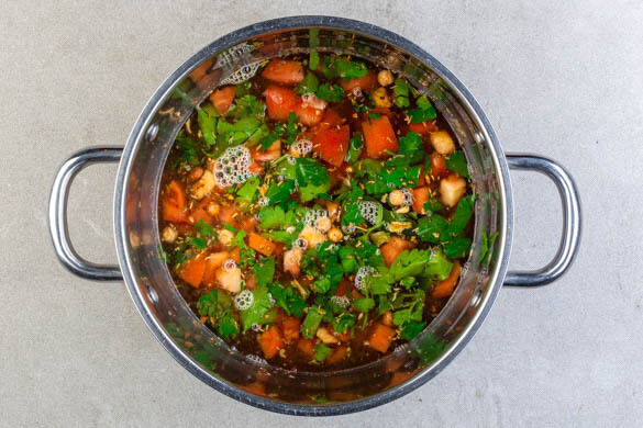 Vorsichtig das heiße Wasser in den Topf gießen. Die Suppe bei mittlerer bis starker Hitze zum Kochen bringen und 13–15Min. köcheln lassen.