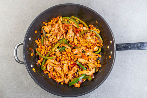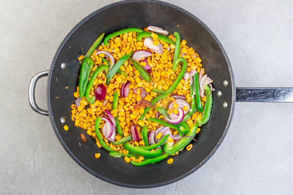 1EL Pflanzenöl in einer großen Pfanne bei starker Hitze erwärmen. Die Paprika und den Mais hinzugeben und ca. 4Min. unter regelmäßigem Rühren braten, bis das Gemüse Farbe annimmt. Dann die Zwiebeln in die Pfanne geben und ca. 2Min. anschwitzen, bis sie glasig sind. Den Knoblauch hinzugeben und ca. 1Min. mitbraten.