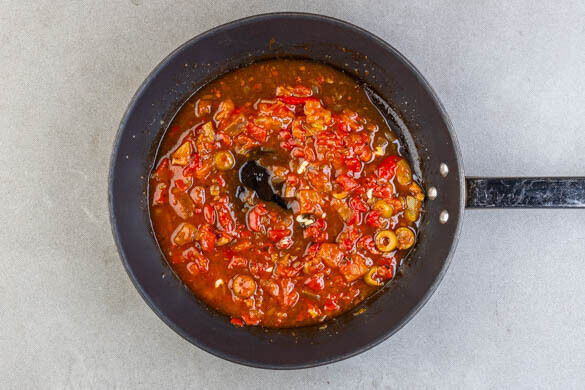 Den Fisch in die Sauce legen, mit 1EL Olivenöl beträufeln und abgedeckt ca. 4Min. sanft garen. Dann vom Herd nehmen und den Fisch abgedeckt noch ca. 4Min. ohne Hitzezufuhr in der Sauce ziehen lassen. Tipp: Der Fisch ist gar, wenn er nicht mehr glasig ist und sich leicht zerteilen lässt.