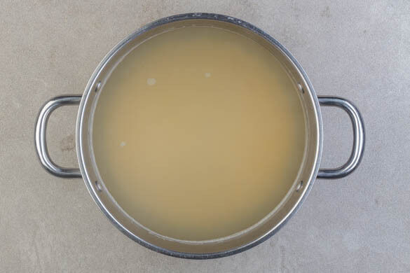 Die Pasta in das kochende Wasser geben und 9–10Min. kochen. Vorsicht: Die Pasta nicht zu lange kochen, da sie später bissfest gekocht wird (siehe Schritt 5). 600ml Pastawasser abschöpfen, dann die Pasta in ein Sieb abgießen und abtropfen lassen.
